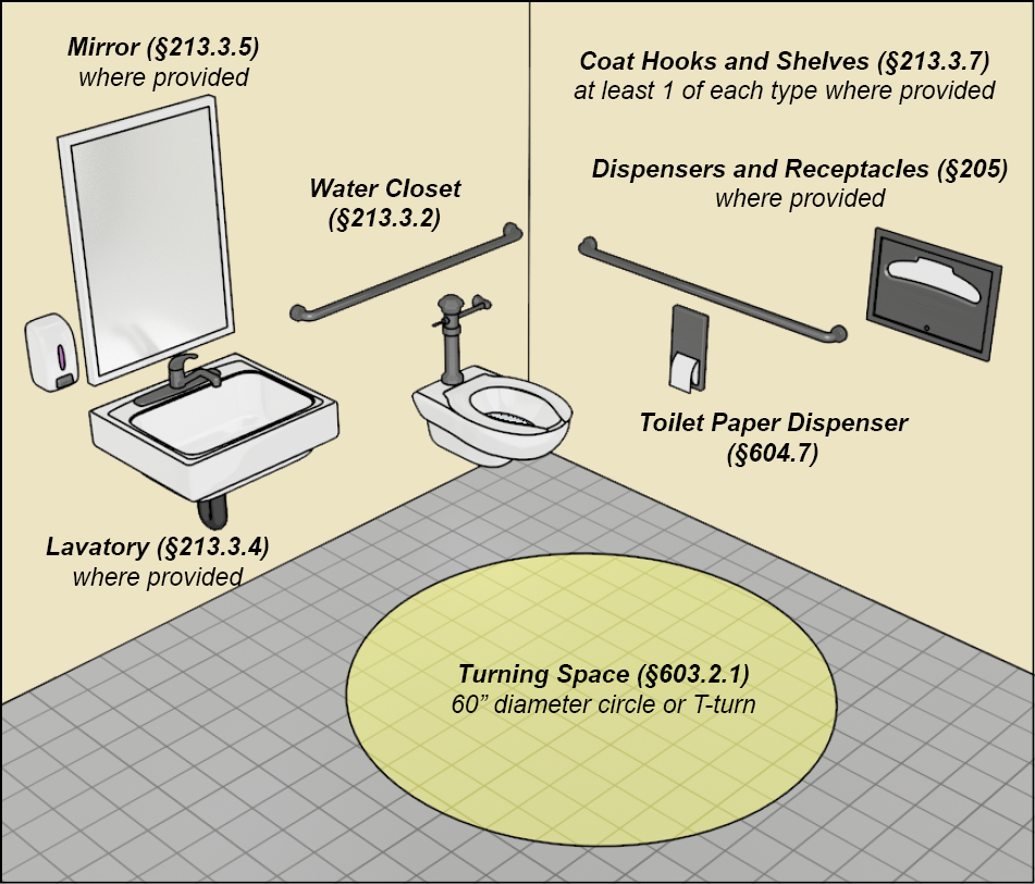This page provides practical guidance for creating accessible restrooms and changing areas that support safety, privacy, ease of use, and dignity for all users. The examples included here reflect only a selection of key ADA requirements. For the full set of standards and technical details, please refer to the official ADA Standards for Accessible Design linked throughout this section.
