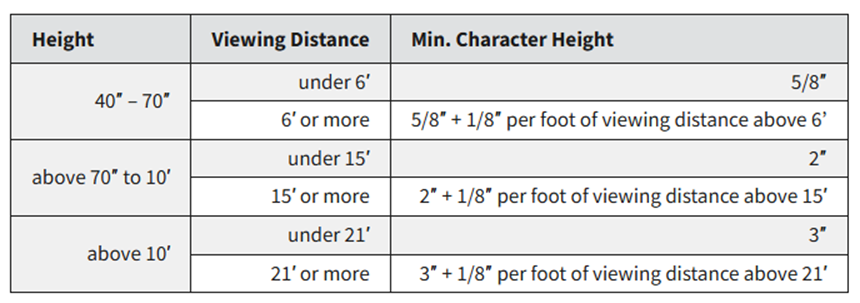 • Mount signs between 40 and 70 inches high to be visible for seated and standing people